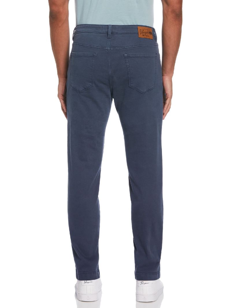 Pantalón de 5 bolsillos en denim con cierre y botón en la cintura. Detalles de remaches metálicos en los bolsillos y aplique de cuero con logo en la parte trasera. Calce slim taper fit, más holgado en cadera y muslos, afinándose hacia el tobillo.